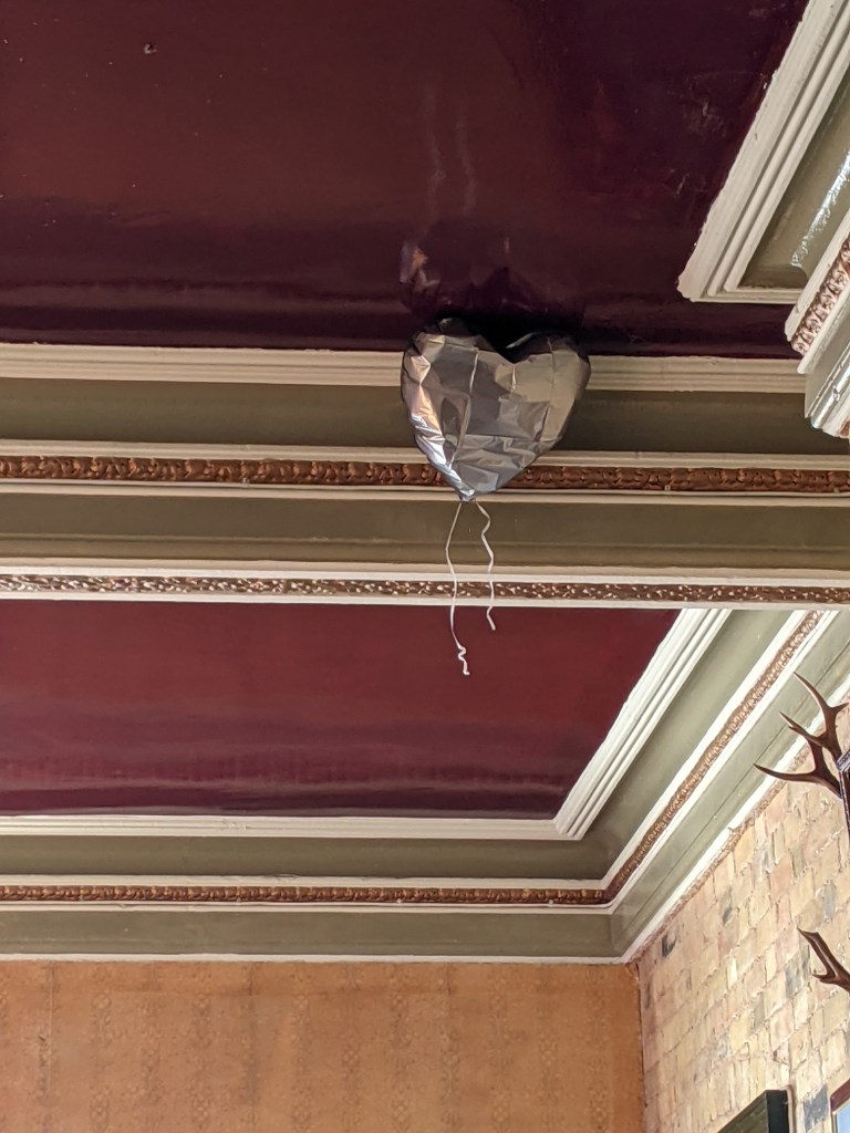 What I actually did for leftovers is below (with several years of leftover wrapping paper), but actually I think this photo is better. The balloon is presumably left over from some previous happening at the venue where we had our Psychedelic Ballroom end of exhibition event.
