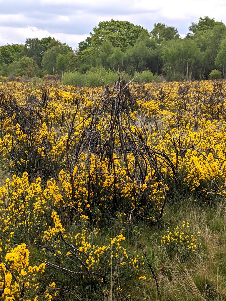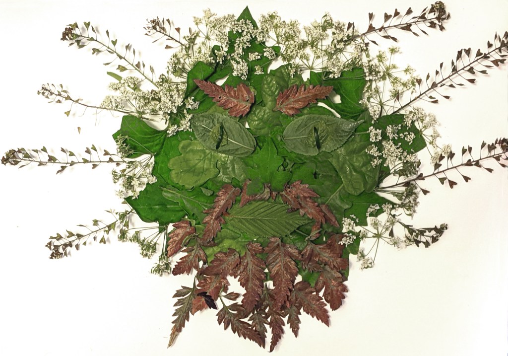 I thought that making a Green Man out of actual leaves might be appropriate, but also on my gathering walk on the heath, I found that the masses of gorse bushes were in full bloom. Gorse is certainly a Beltane plant as it looks quite fire-like.