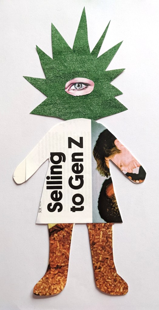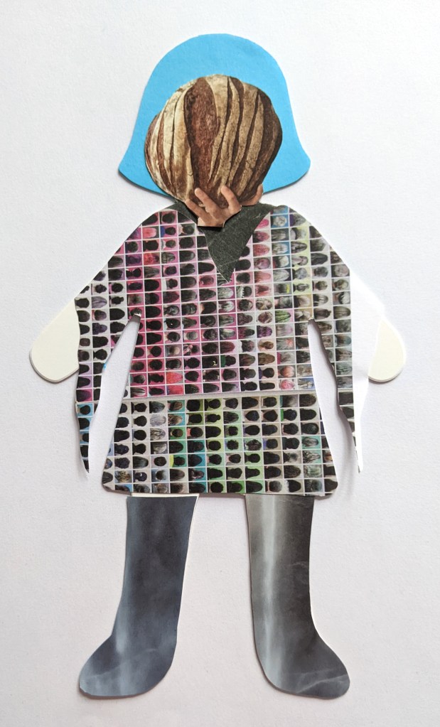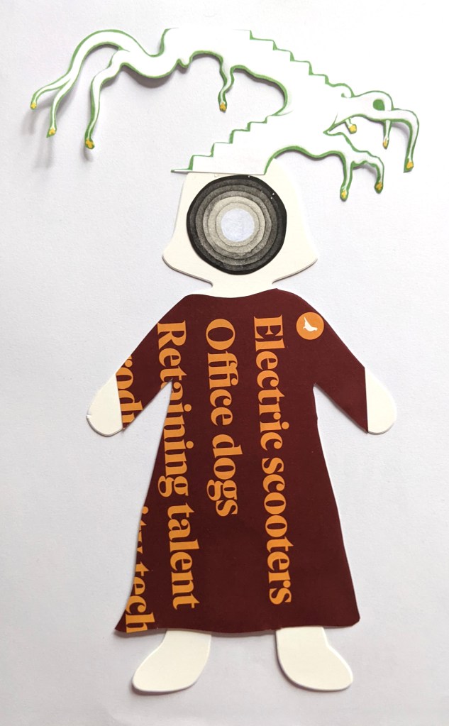 For this week, we had a pub meetup, and I took along some pound shop people shapes to decorate. I decided to use collage for mine, so this is “people are strange”.